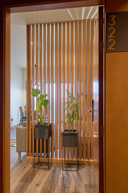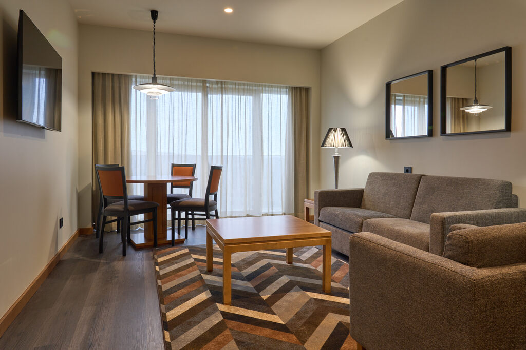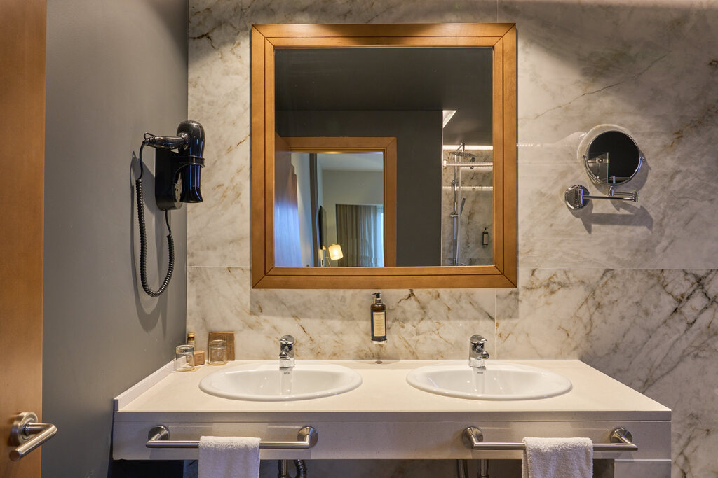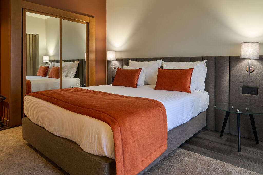 Quarto Duplo com cama de casal, sala de estar, ar condicionado, mini-bar, telefone, cofre, WIFI, secretaria, serviço de despertar, televisão. WC com Banheira, conjunto de amenities Damana e secador de cabelo.